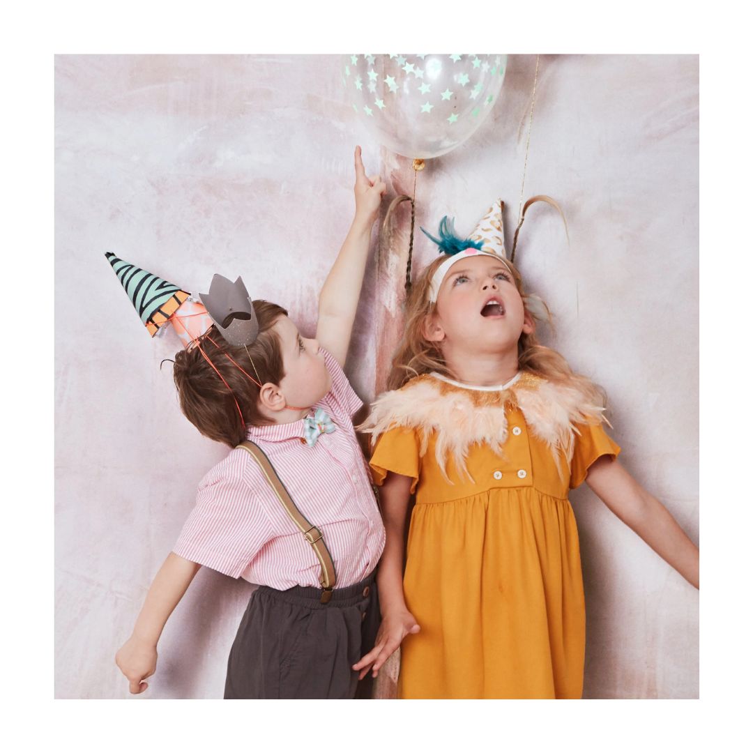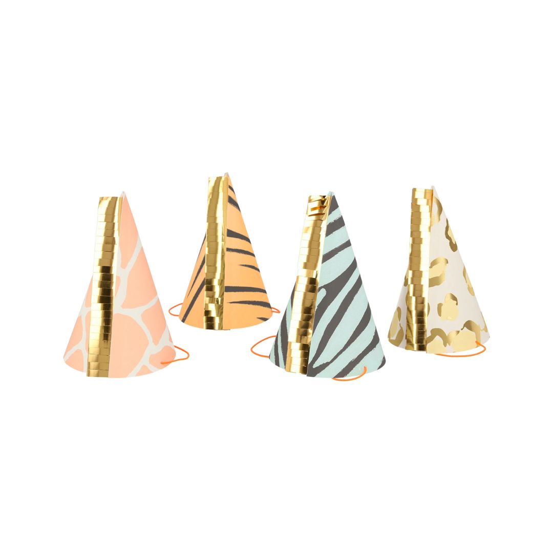 Get the party started with these fun Meri Meri safari animal print party hats! Featuring bold zebra, leopard and tiger patterns with gold foil details and gold foil fringing, this pack of eight adds a wild touch to any jungle or safari celebration. Neon elastic.
